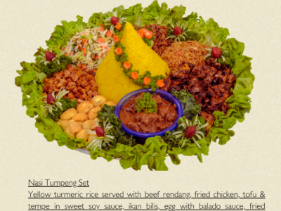 This is traditional an Indonesian cone yellow rice shaped with side dishes: Beef rendang, fried chicken, tofu and tempe in sweet soya sauce, mie goreng, ikan bilis , mixed vegies gado gado peanut sauce, deep fried egg with balado sauce