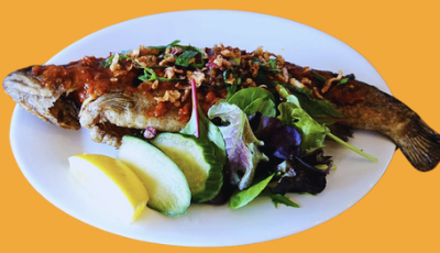 Seafood Ikan Bakar Taliwang Char grilled whole rainbow trout with our own soya glaze and spicy Taliwang sauce $23.95 Ikan Bakar Belacan Char grilled whole rainbow trout with our own soya glaze and spicy sambal belacan $23.95 Grilled Prawns Chilli Penyet grilled Prawns with homemade spicy penyet sauce $18.50 Ikan Goreng Rica Sauce Deep fried rainbow trout top up with rica sauce $23.95
