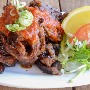 Char Grilled Beef Rib with our own glaze and top up with our homemade penyet chilli sauce OR Peanut sauce
