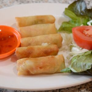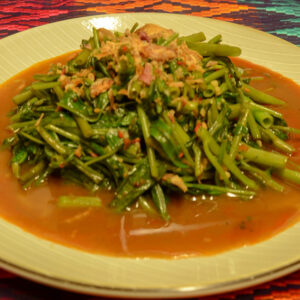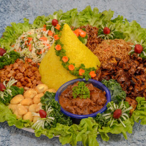 This is traditional an Indonesian cone yellow rice shaped with side dishes: Beef rendang, fried chicken, tofu and tempe in sweet soya sauce, mie goreng, ikan bilis , mixed vegies gado gado peanut…
