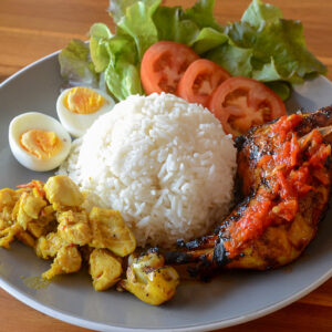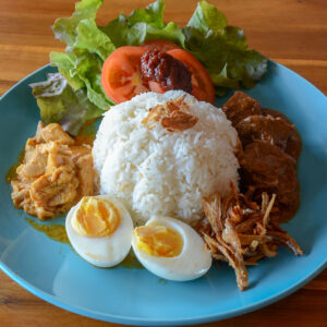 Combo fragrant rice cooked in coconut milk served with beef Rendang, Egg, Ikan Bilis, Chicken Curry and special sambal lemak