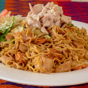 Fried egg noodles with vegetables and chicken with oyster soya sauce served with tea tarik, coffee or tea