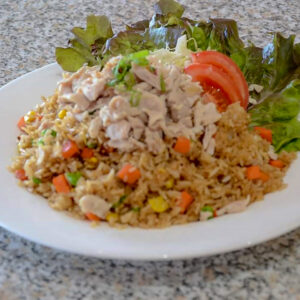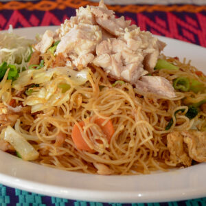 Fried bihun rice noodles tossed with mixed vegetables and chicken with oyster soya sauce