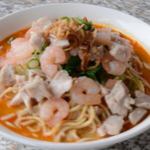 Mixed Noodles, Bean sprouts, Tofu, Prawn and Chicken in coconut curry laksa soup