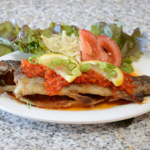 Char grilled whole rainbow trout with our own soya glaze and spicy sambal belacan