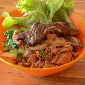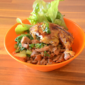 Boiled homemade egg noodles top up with Chicken Mushroom and quarter Grilled Chicken served with soup on the side