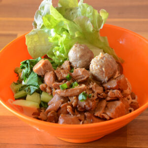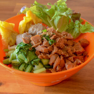 Boiled homemade egg noodles top up with chicken mushroom, chicken wontons, beef balls and soup on the side