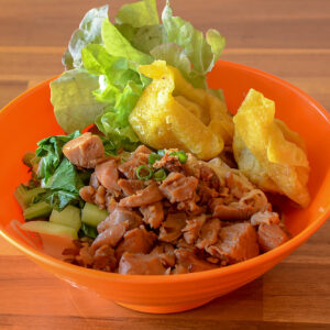 Boiled homemade egg noodles top up with chicken mushroom, chicken wontons and soup on the side